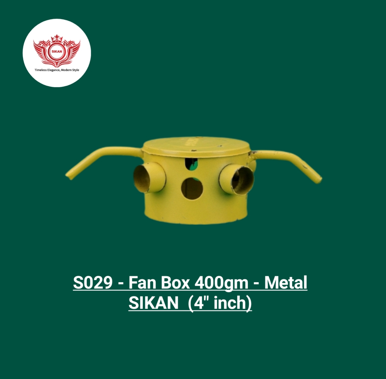 Discount: -30%+18%gst Brand: SIKAN Material: Metal Fitting Type: Fan Box Color: Yellow Size: 4" inch Code: S029